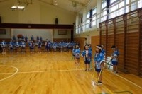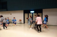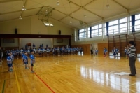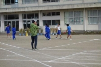 競技です。湯本小と大里小の高学年が合わさると30人ほどになり、2コートで盛り上がり