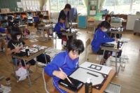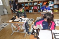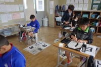 いました。教室には、集中した子どもたちの表情があり、墨のにおいがただよって、とても