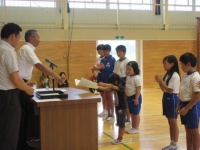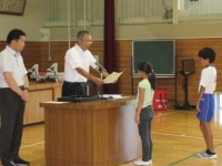 7日、9月の大里タイムとして表彰と校長講話がありました。表彰では、書写のたなばた