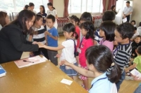 た。また、全校生が自分の名まえとメッセージを書いた名刺カードを2人の先生に渡し