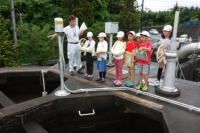 浄水場を見学しながら説明を受け、釈迦堂川からくみ上げられた水が、沈殿、