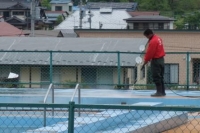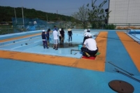 です。それに先だって業務員の板橋さんが、プールのまわりを高速洗浄機を使って、洗い