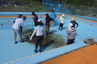 業務員の板橋さんが計画的にプールの周りを高圧洗浄機で清掃を行っていましたので、