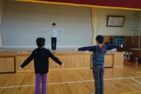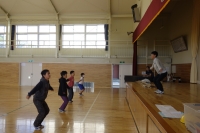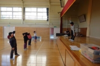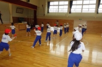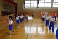 11日の朝、体育委員会の子どもたちが体育館で「ラジオ体操」の特訓をしていました。