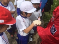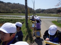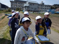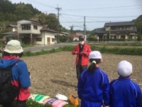9日、3・4年生が「総合的な学習の時間」の米づくりの活動で、田んぼに出かけ、