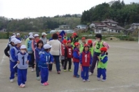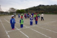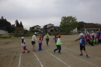 校庭半周を全員が走ります。体育主任の金澤先生が「今日は初めてなので、チームの