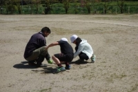 くまなく肥料をまくことができました。子どもたちは肥料の臭いをかいで質問する