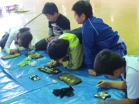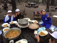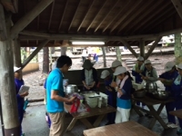 宿泊学習2日目になりました。今のところ、体調を崩す子もなく,元気に活動しています。朝のつどいでは、今日は大里小の代表児童はラジオ体操で活躍しました。朝ごはんではオリジナル焼きたてパンが大人気でした。午前の活動は野外炊飯で、どの班も協力して火傷などなく素晴らしいカレーとご飯が出来ました。片付けチェックも一発合格でした。