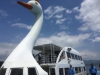 午後は,まず白鳥号で猪苗代湖の翁島巡りです。