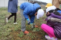 大里タイムに自然観察をしました。校庭の木々も紅葉を終えて落ち葉がたくさん増えました。葉のなくなった木々を見て、校庭の様子も夏のころに比べるとすっかりさびしくなってしまいましたが、まだ花が咲いている植物があるということで、みんなで探しに行きました。その花は「ハキダメギク」というそうです。よく見ると、たしかに小さな花を咲かせていました。子どもたちはその花を見つけると「すごい!まだ咲いてる!」「小さくてかわいい!」と驚いていました。