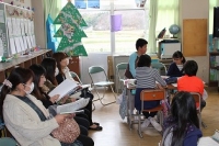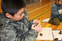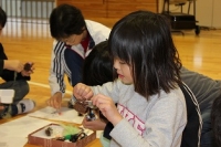 大里タイムで松ぼっくりツリー作りをしました。縦割り清掃班ごとに分かれて材料を分け合いながら一人一つ作りました。つまようじにボンドを付けてていねいにビーズやモールなどを飾り付けていました。2~6年生は昨年度も作っているので、まだ作り方の知らない1年生に優しく教えたり、お休みの友達の分を同じグループの子が作るなど、優しい一面が多く見られました。