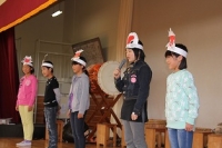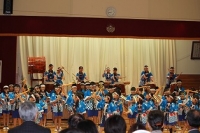 次に、1年生が元気いっぱいにはじめの言葉を発表しました。そして、『丹波たて山わらし太鼓』を発表しました。地区合奏祭の時と同様に迫力ある演奏でした。