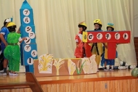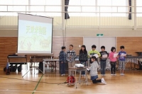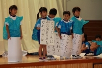 次に、1、2年生が『ことばあそび』を発表しました。全員で「小川のマーチ」や「うんとこしょ!」を元気よく体全体を使って発表しました。グループに分かれて「どんぐりころころ」「俳句」「早口ことば」を発表しました。むずかしい言葉もしっかり覚えて大きな声で発表することができました。