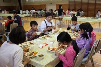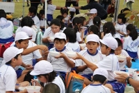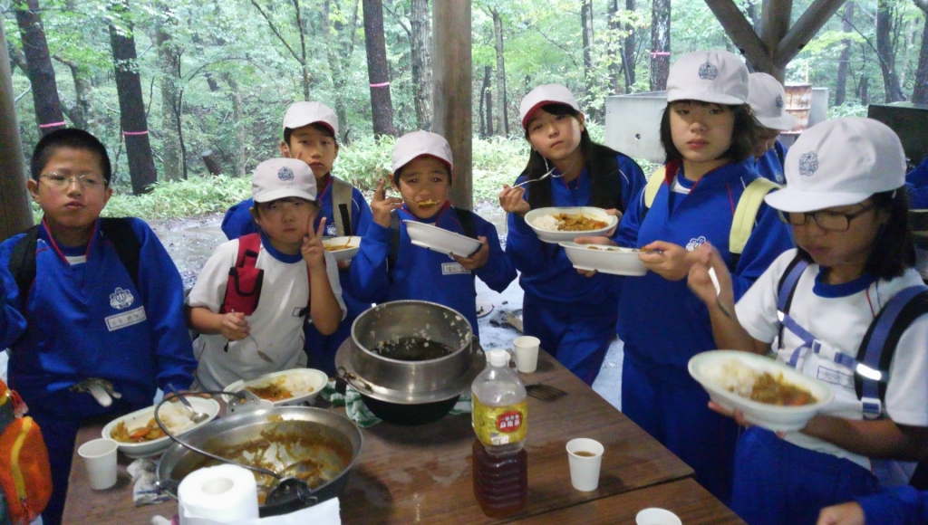 午前中は野外炊飯を行いました。材料や用具を運ぶ係,火を起こす係,調理をする係に分かれて,協力しておいしいカレーライスを作ることができました。