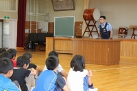 本日、防犯教室を行いました。今回は不審者が学校内へ侵入する想定で行いました。子どもたちは素早く避難し、静かに教室で待機するなど、先生の指示をよく聞いて落ち着いて行動することができました。全体会では、警察の方々から不審者への対応の仕方を教わりました。まずは、知らない人と話す時には距離を取って話す練習をしました。次に大声で「助けて!!」と叫ぶ練習をしました。どの学年も大きな声で助けを呼ぶことができました。