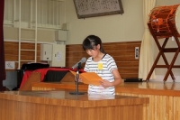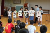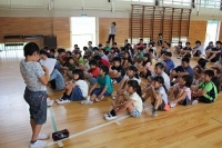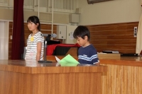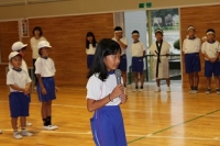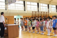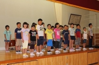 4校時目に、第1学期終業式を行いました。校長先生から「1学期にどんなことができるようになりましたか?」と聞かれると子どもたちは指折り数えていました。両手では数え切れないほどたくさんある子もいました。自分の成長を実感し、満足感を得ていました。次に、2年生と5年生児童が作文発表をしました。鍵盤ハーモニカで「かえるの合唱」が弾けるようになったこと、辞書が引けるようになったこと、クロールで25m泳げるようになったことなど、1学期にできるようになったことを発表しました。また、夏休みには算数の勉強や平泳ぎをがんばるというめあても発表しました。堂々と発表ができて立派でした。