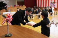 証書授与の場面では,卒業生9名が,中学校生活に向けて自信に満ち溢れた笑顔で卒業証