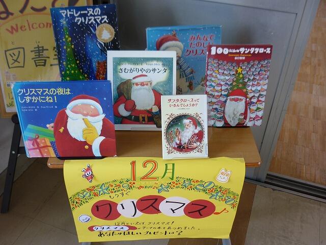 12月5日(木) 子どもたちが,12月といって連想するのは「クリスマス」や「サンタクロース」ではないでしょうか。図書室前には,「クリスマス」や「サンタクロース」に関する本が並べられていました。