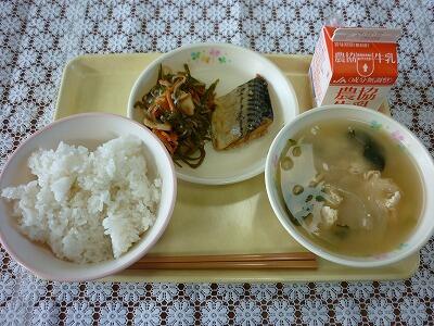 本日の給食は,天栄米ごはん,さばのみそ煮,すき昆布のいため物,油揚げとじゃがいものみそ汁,牛乳でした。
