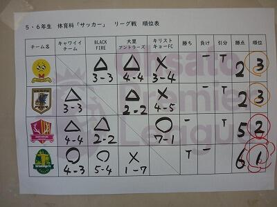 5・6年生が体育の時間に4チームに分かれ,サッカーリーグ戦を行ってきました。対戦成績の詳細は左表のとおりですが,サッカー好きの男子はもちろんのこと,女子も元気いっぱいに走り回りボールを追いかけていました。