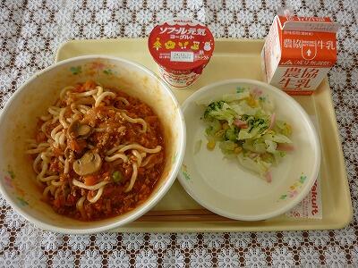 本日の給食は,ソフトめん,ミートソース,ブロッコリーサラダ,,ヨーグルト,牛乳でした。