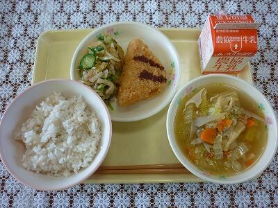 本日の給食は,麦ごはん,ハムチーズサンドフライ,ゆずおかかあえ,さつま汁,牛乳でした。
