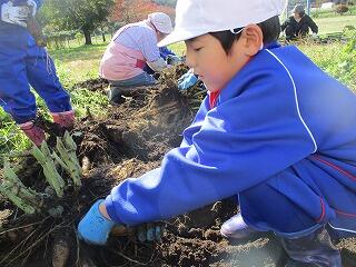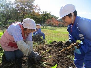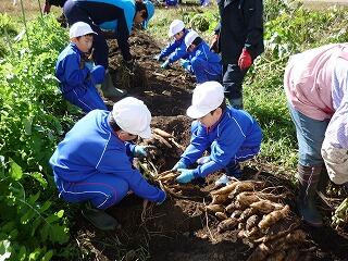1・2年生が,育ててきた天栄名物のヤーコンを掘りました。春に植えたときと同じようにヤーコン名人の添田さんにご指導をいただきました。