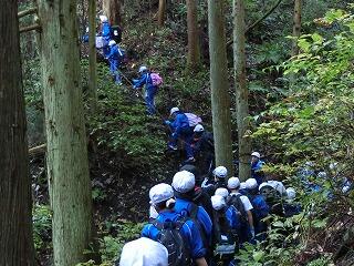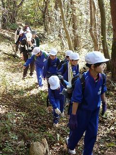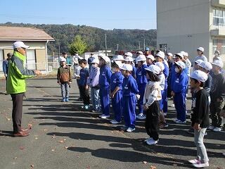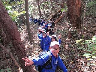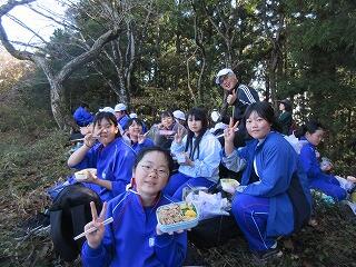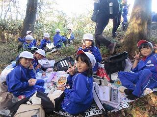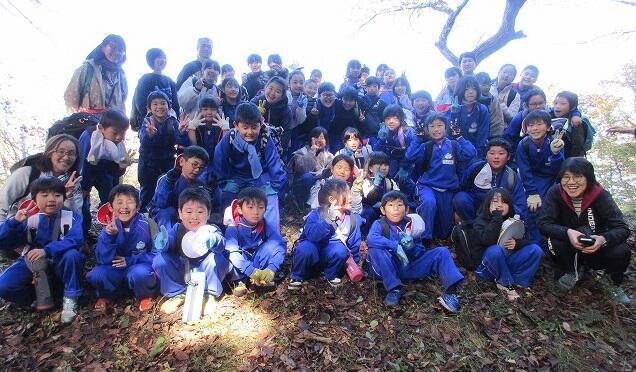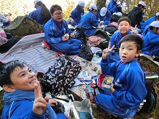 11月11日(月) 全校生で学校近くの丹波楯山(標高562m)を登山してきました。晴天でしたが,昨夜の雨で山道は所どころ滑る状態でした。教職員を各班に配置し安全には十分配慮して歩きました。2日前にも教職員2名で山頂までの道を安全確認し,歩きにくいほど伸びた草や小枝を整備しました。その甲斐もあり,1年生も誰も弱音を吐かず,山頂まで登山することができました。清掃班での活動だったため,高学年の児童が励ましたり,手助けしてくれたりしたことが大きな力となったようです。滑りやすい道や登山道をふさぐ倒木なども,児童のアドベンチャー感を高めてくれて楽しく登ることができました。山頂でみんなで食べたお弁当は,とてもおいしかったです。「子どもが作るお弁当の日」だったので,自分で作ったお弁当の話題もたくさん出ていました。