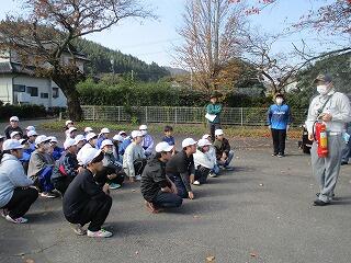 11月14日(木) 全国火災予防週間のこの日,家庭科室から出火した想定で,休み時間に予告なしで避難訓練を行いました。火災発生を知らせる校内放送をよく聞いて,自分で避難経路を考えなければなりません。火元から遠い校舎西側駐車場まで2分20秒ほどで全員安全に避難することができました。