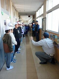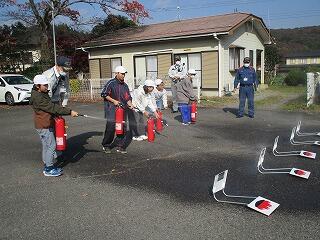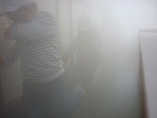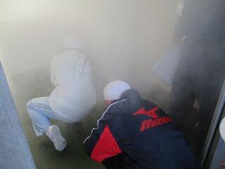 その後,消防署員さんに消火器の使い方を教えていただき,代表児童5名が水消火器を使い消火訓練を行いました。さらに家庭科室に移動し,けむり体験を行いました。煙が部屋に充満するとどれだけ視界が悪くなるのか,特に上の方は見えないので体を低くしたり,煙を吸い込まないようにしたりすることが大切と実体験を通して学びました。