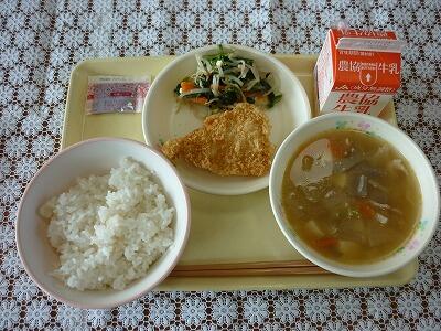 本日の給食は,天栄米ごはん,県産かじきカツ,県産ほうれん草のチーズあえ,福島の芋煮汁,牛乳でした。