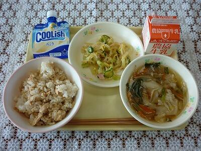 本日の給食は,11月生まれお祝い献立でした。シーチキンごはん,春雨サラダ,肉ワンタンスープ,牛乳,アイスクリームでした。