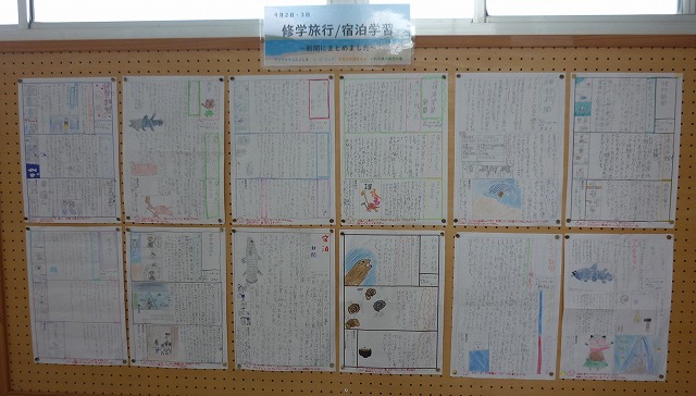 9月30日(月) 5年生教室廊下には,修学旅行・宿泊学習の思い出を一人ひとりが壁新聞にまとめ掲示してあります。それを読むと,どの児童も楽しい思い出になったことがわかります。ここでは紹介しきれないので,詳しくは授業参観の時にお読みください。よろしくお願いします。