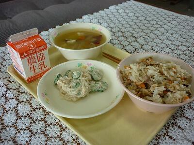 本日の給食は,きのこごはん,こんにゃくごまサラダ,さつま汁,牛乳でした。