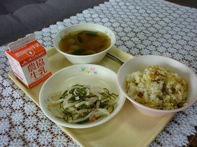本日の給食は,シーフードピラフ,大根と昆布のサラダ,肉だんごスープ,牛乳でした。