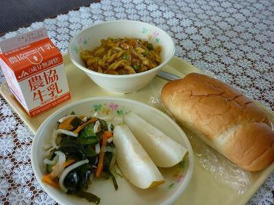 本日の給食は,バターロール,マカロニのカレー煮,海藻サラダ,なし,牛乳でした。