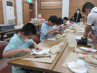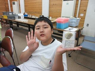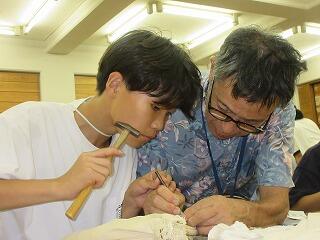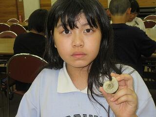 見学後は,アンモナイト標本をクリーニングする体験をしました。化石に付いている石や汚れを,釘と金槌を使って丁寧に取り除いていきます。自分でクリーニングした標本は,お土産に頂いてきました。