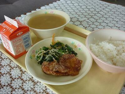 本日の給食は,天栄米ごはん,鶏肉のレモンソース,三色おひたし,けんちん汁,牛乳でした。