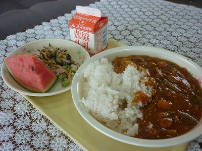 本日の給食は,麦ごはん,夏野菜カレー,ひじきと枝豆のサラダ,すいか,牛乳でした。