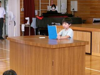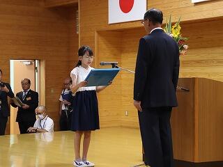 また,10年後の自分へのメッセージを4年生児童を代表して,本校児童が村長さんに手渡しました。10年後の成人式に返却されることになります。
