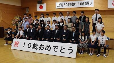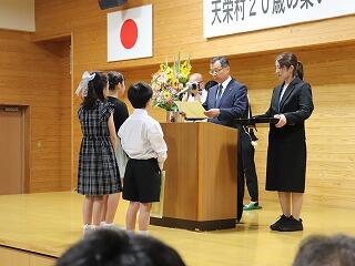 8月15日(木) 文化の森てんえいにて,成人式と共に,2分の1成人式(10歳の集い)が開催され,4年生5名が参加しました。添田村長さんから10歳証書を各小学校代表児童に授与されました。各小学校4年生のみなさん,おめでとうございます。