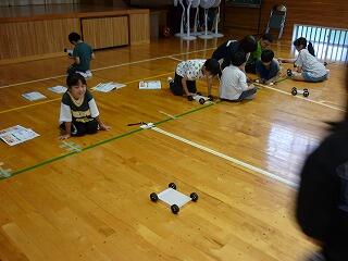 左:3年生は,体育館で理科の実験をしていました。ゴムの伸ばした長さと力の関係を調べていました。