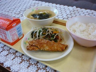 本日の給食は,天栄米ごはん,さばの竜田揚げ,おひたし,じゃがいものみそ汁,牛乳でした。