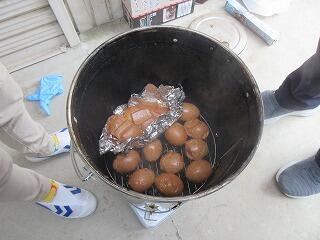 昨日のクラブ活動で,アウトドアクラブは燻製づくりに挑戦しました。サクラチップを使い,香ばしいゆで卵などができ上がりました。