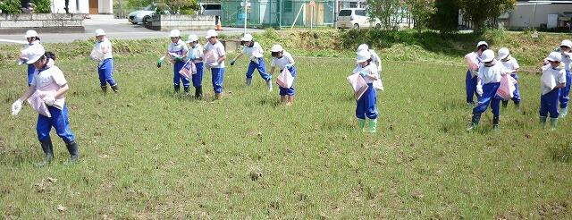 4月26日(金)3・4年生が,学校田に肥料をまきました。有機肥料を用いて安心安全な米作りに配慮しています。子ども達は田んぼに1列に並び「おいしくなあれ,おいしくなあれ」と唱えながら,願いを込めて肥料をまいていきました。