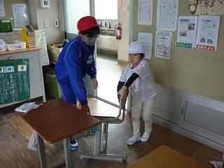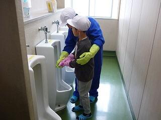 5月7日(火)本日の清掃より,1年生が参加することになりました。児童は46人だけなので,1年生でも大切な戦力となります。各所で,丁寧に清掃のやり方を教える上級生の姿が見られました。