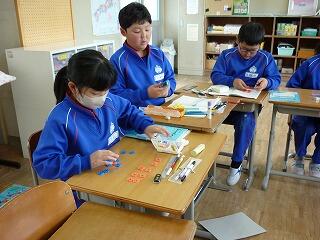 5月9日(木)3年生が初めてのわり算に挑戦していました。「18÷6」で計算する問題を,おはじきなどの具体物を用いて解き方を一生懸命に考えていました。