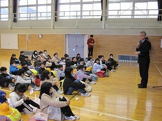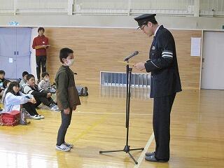 まず,天栄駐在所の高久さんより,6年生が「家庭の交通安全推進員」に委嘱されました。家族にも交通安全への取組を呼びかけていきます。