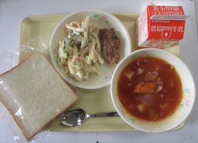 食パン・鶏肉のハーブ焼き・マカロニサラダ・ミネストローネ・福島県産リンゴジャム・牛乳,です!