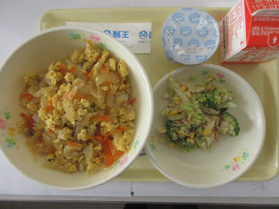 親子丼・ブロッコリーのおかかマヨ和え・ヨーグルト・牛乳,です。